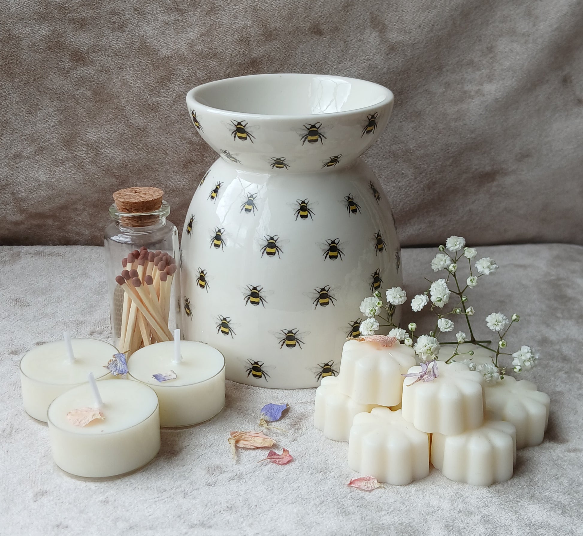 A sweet little bumblebee wax melt burner in a gift box, with 10 natural soy wax, flower shape melts, infused with high quality, vegan friendly, cruelty free and paraben free essential oils and fragrance oils. The wax melts are individually wrapped, this way you get a selection of 10 different gorgeous scent to try. Wax melt are approximately 10g each. The tealights are handmade, using soy wax, in polycarbonate eco friendly cups, which come wrapped in a glassine bag. A dinky glass bottle of safety matches, which has a little striker on the back, comes in a small hessian drawstring bag, plus a wax melt safety/care card. All orders are gift wrapped using as much eco-friendly, biodegradable packaging as I can. This includes a kraft gift box, shredded paper/wood wool and beautifully completed with a sprinkle of dried flower petals with an organza bow and cream & brown paper ribbon, giving your parcel a timeless and rustic feel.