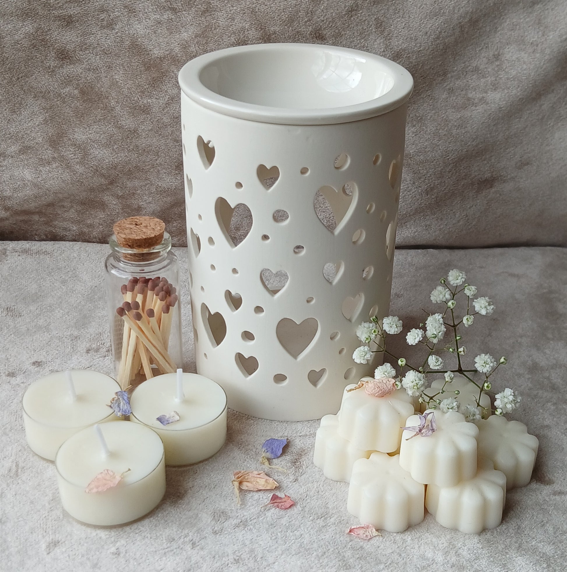 A lovely cream wax melt burner with cut out hearts in a gift box, with 10 x soy wax melts, infused with high quality, vegan friendly, cruelty free and paraben free essential oils and fragrance oils. The wax melts are individually wrapped, this way you get a selection of 10 different gorgeous scent to try. Each wax melt is approximately 10g. The tealights are handmade, using soy wax, in polycarbonate eco friendly cups, which come wrapped in a glassine bag. A dinky glass bottle of safety matches, which has a little striker on the back, comes in a small hessian drawstring bag, plus a wax melt safety/care card. All orders are gift wrapped using as much eco-friendly, biodegradable packaging as I can. This includes a kraft gift box, shredded paper/wood wool and beautifully completed with a sprinkle of dried flower petals with an organza bow and cream & brown paper ribbon, giving your parcel a timeless and rustic feel. If you have any questions, please do not hesitate to contact me on lillywoodcandles@gmail.com