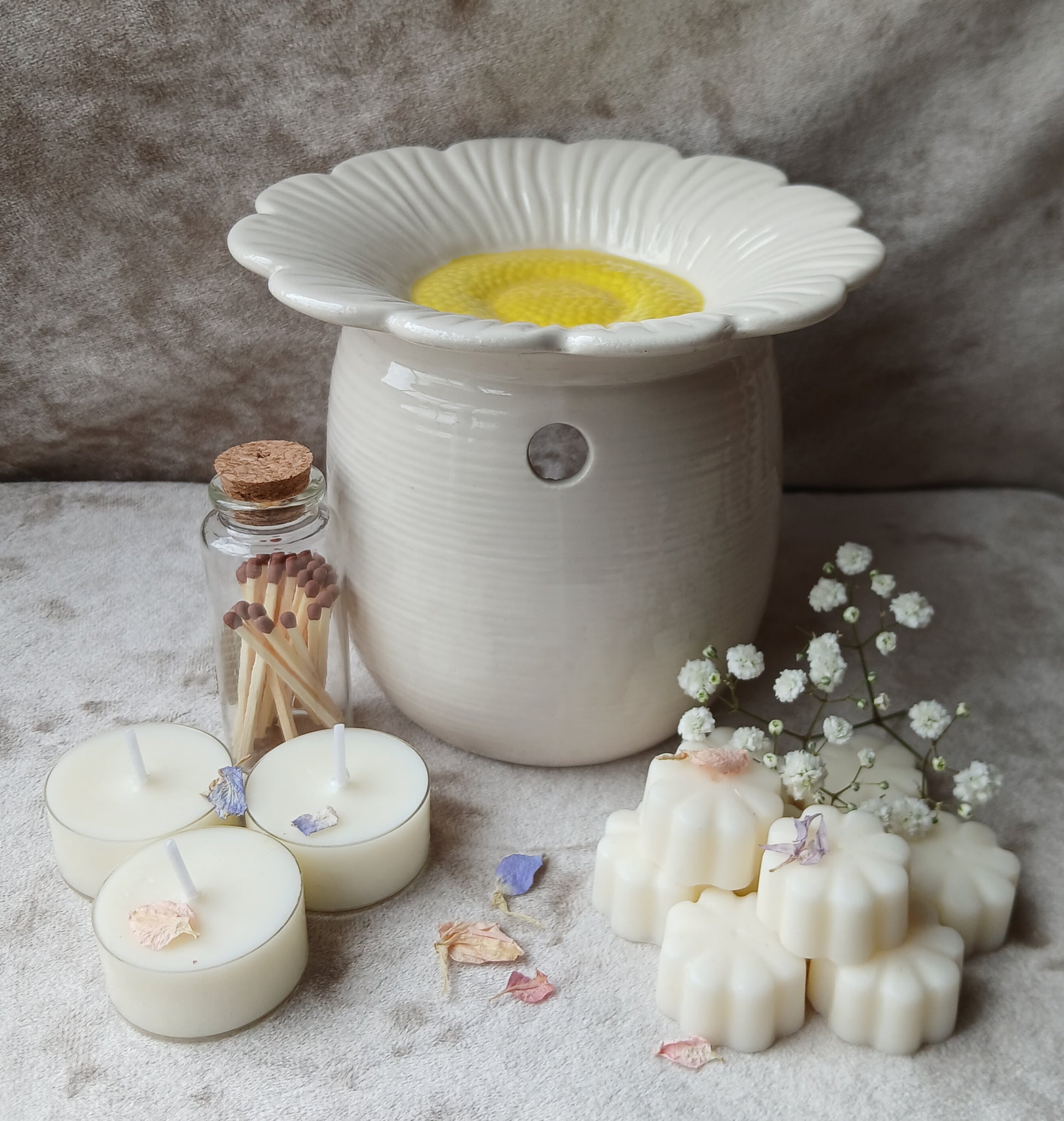 Lovely daisy wax melt burner in a gift box, with 10 natural soy wax, flower shape melts, infused with high quality, vegan friendly, cruelty free and paraben free essential oils and fragrance oils. The wax melts are individually wrapped, this way you get a selection of 10 different gorgeous scent to try. Wax melt are approximately 10g each. The tealights are handmade, using soy wax, in polycarbonate eco friendly cups, which come wrapped in a glassine bag. A dinky glass bottle of safety matches, which has a little striker on the back, comes in a small hessian drawstring bag, plus a wax melt safety/care card. All orders are gift wrapped using as much eco-friendly, biodegradable packaging as I can. This includes a kraft gift box, shredded paper/wood wool and beautifully completed with a sprinkle of dried flower petals with an organza bow and cream & brown paper ribbon, giving your parcel a timeless and rustic feel. If you would like a wax melt burner gift box sent as a gift, please complete the details below, many thanks. x
