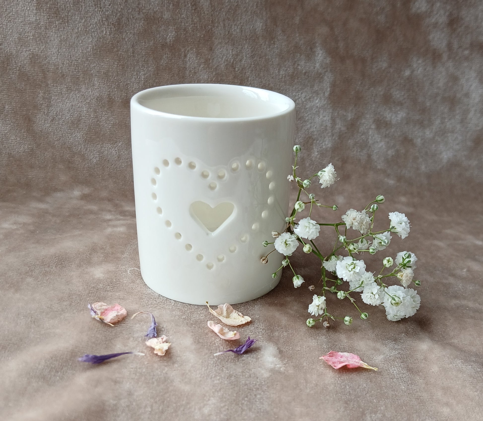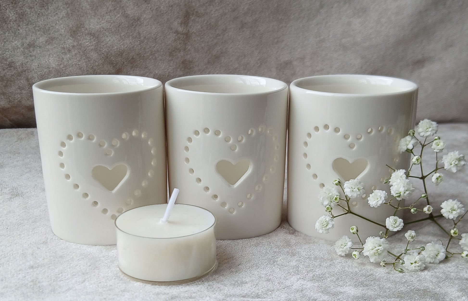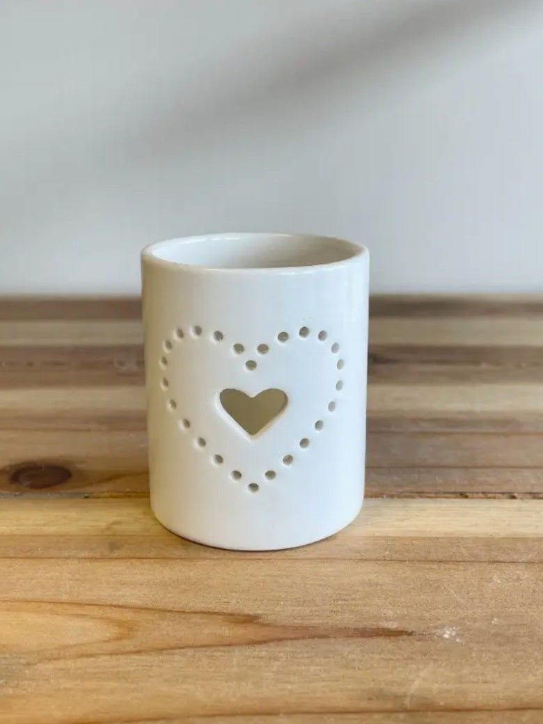 A ceramic T-light holder complete with a smooth white glaze look and dotted heart decal