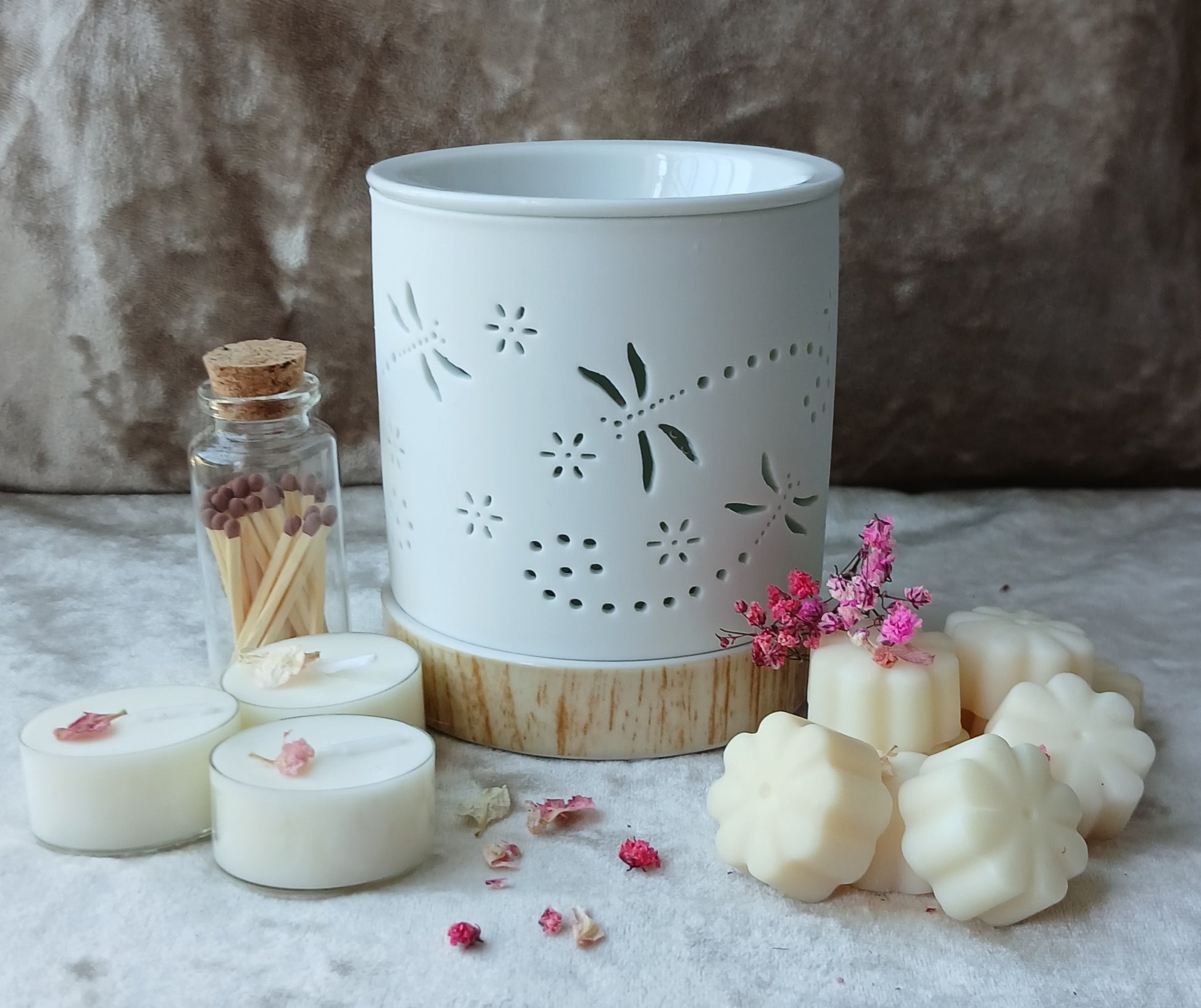 A pretty cut out dragonfly pattern, wax melt burner in a gift box, with 10 natural soy wax, flower shape melts, infused with high quality, vegan friendly, cruelty free and paraben free essential oils and fragrance oils. The wax melts are individually wrapped, this way you get a selection of 10 different gorgeous scent to try. Wax melt are approximately 10g each. The tealights are handmade, using soy wax, in polycarbonate eco friendly cups, which come wrapped in a glassine bag. A dinky glass bottle of safety matches, which has a little striker on the back, comes in a small hessian drawstring bag, plus a wax melt safety/care card. All orders are gift wrapped using as much eco-friendly, biodegradable packaging as I can. This includes a kraft gift box, shredded paper/wood wool and beautifully completed with a sprinkle of dried flower petals with an organza bow and cream & brown paper ribbon, giving your parcel a timeless and rustic feel. If you would like a wax melt burner gift box sent as a gift, please complete the details below, many thanks. x