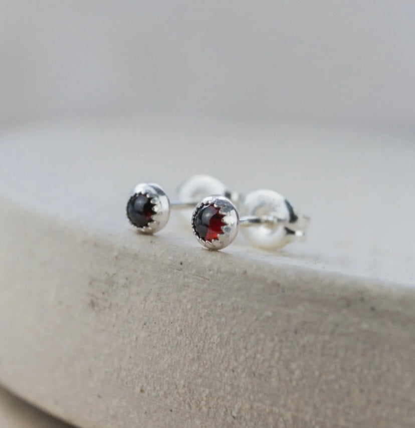 Handmade sterling silver mini studs with a semi precious Garnet birthstone, perfect for everyday wear. You can order any of the twelve month birthstones, or alternatively we also have the choice of Labradorite, Amazonite, Labradorite, Rose Quartz and Blue Opalite stones. Each semi precious stud stone is 3mm in size and is set in sterling silver. The prices may vary depending on your choice of stone. Please note that we use natural semi precious stones where possible, however the following stones are lab created; Ruby, Sapphire, Opalite, Blue Opalite. Emerald is Cubic Zirconia. All jewellery comes in a hessian drawstring bag, to give it a timeless rustic feel.