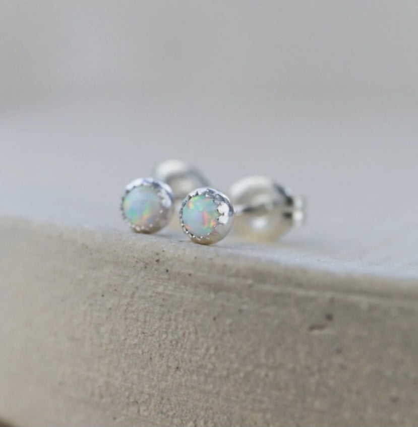 Handmade sterling silver mini studs with a semi precious Opalite birthstone, perfect for everyday wear. You can order any of the twelve month birthstones, or alternatively we also have the choice of Labradorite, Amazonite, Labradorite, Rose Quartz and Blue Opalite stones. Each semi precious stud stone is 3mm in size and is set in sterling silver. The prices may vary depending on your choice of stone. Please note that we use natural semi precious stones where possible, however the following stones are lab created; Ruby, Sapphire, Opalite, Blue Opalite. Emerald is Cubic Zirconia. All jewellery comes in a hessian drawstring bag, to give it a timeless rustic feel.