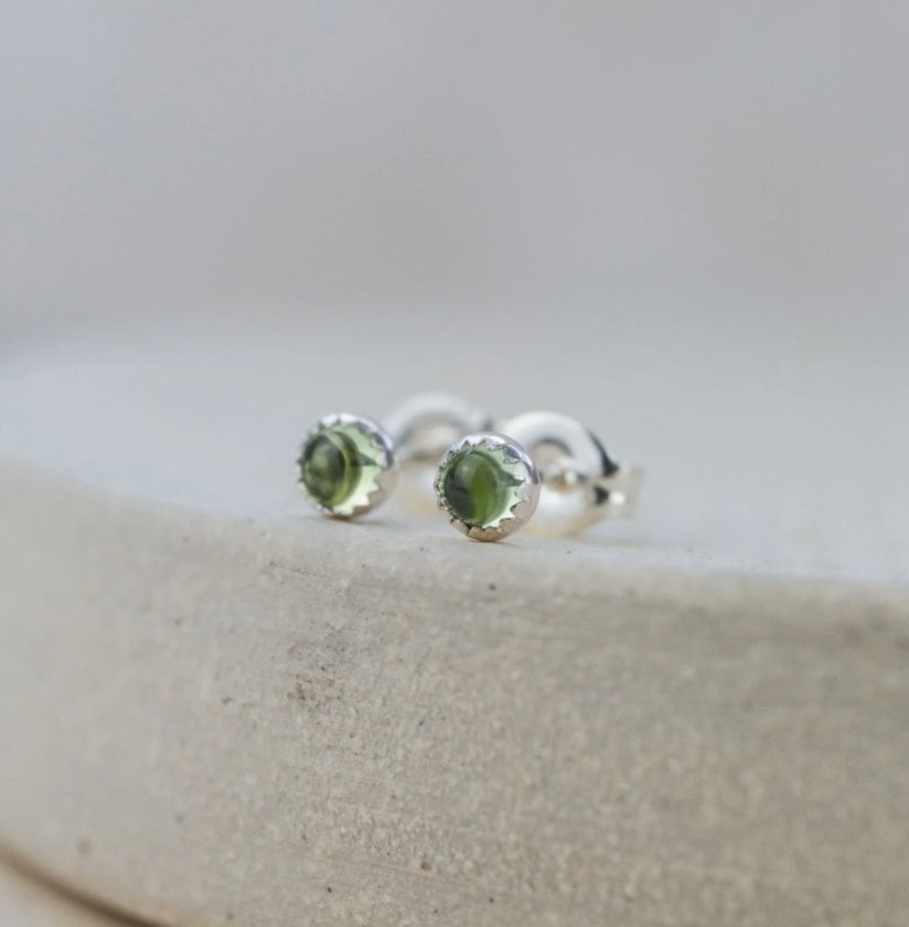 Handmade sterling silver mini studs with a semi precious Peridot birthstone, perfect for everyday wear. You can order any of the twelve month birthstones, or alternatively we also have the choice of Labradorite, Amazonite, Labradorite, Rose Quartz and Blue Opalite stones. Each semi precious stud stone is 3mm in size and is set in sterling silver. The prices may vary depending on your choice of stone. Please note that we use natural semi precious stones where possible, however the following stones are lab created; Ruby, Sapphire, Opalite, Blue Opalite. Emerald is Cubic Zirconia. All jewellery comes in a hessian drawstring bag, to give it a timeless rustic feel.