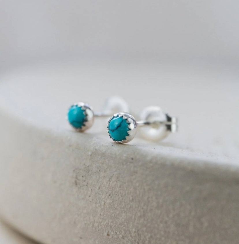 Handmade sterling silver mini studs with a semi precious Turquoise birthstone, perfect for everyday wear. You can order any of the twelve month birthstones, or alternatively we also have the choice of Labradorite, Amazonite, Labradorite, Rose Quartz and Blue Opalite stones. Each semi precious stud stone is 3mm in size and is set in sterling silver. The prices may vary depending on your choice of stone. Please note that we use natural semi precious stones where possible, however the following stones are lab created; Ruby, Sapphire, Opalite, Blue Opalite. Emerald is Cubic Zirconia. All jewellery comes in a hessian drawstring bag, to give it a timeless rustic feel.