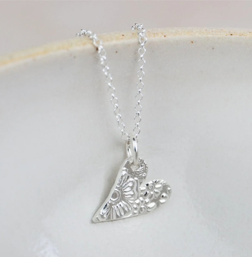 Each sterling silver heart charm is hand cut with a delicate texture to the front. It is approximately 15mm in length. It is a pretty pendant and would make for a very special gift. All jewellery comes in a kraft jewellery gift box and a hessian drawstring bag, tied with organza & paper ribbon to give it a timeless, rustic feel.