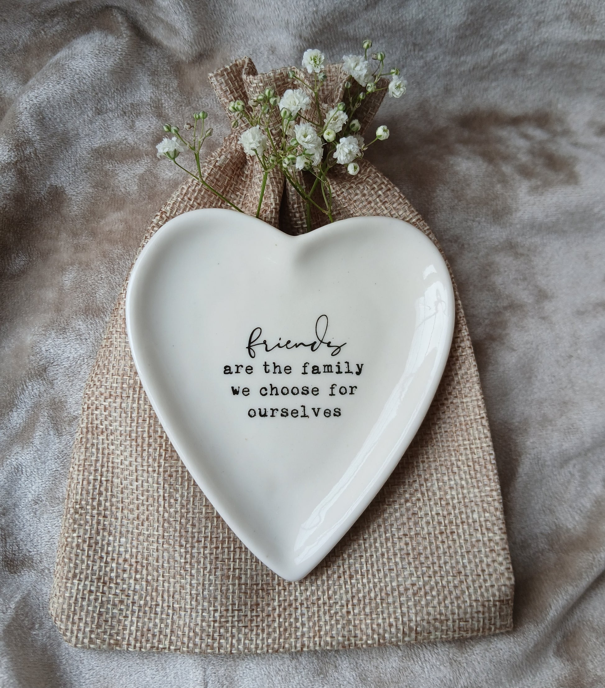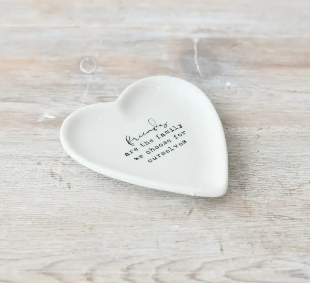A lovely heart shape trinket dish that reads, 'friends are the family we choose for ourselves'