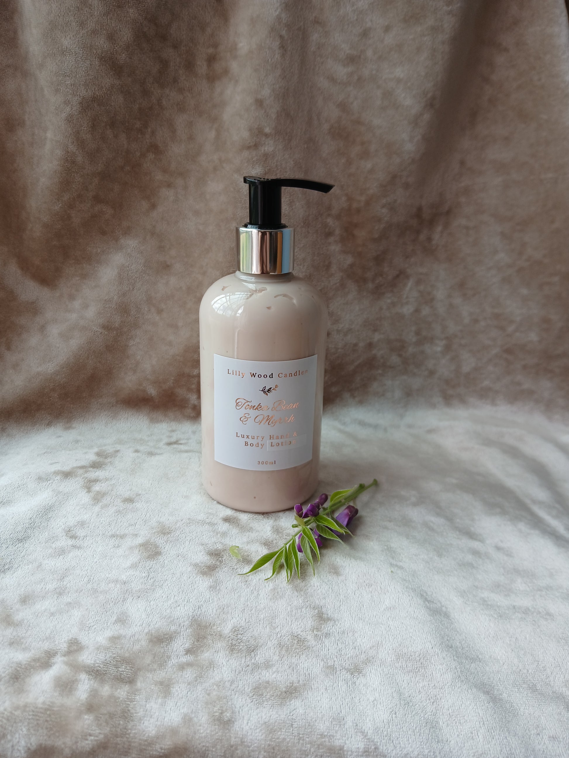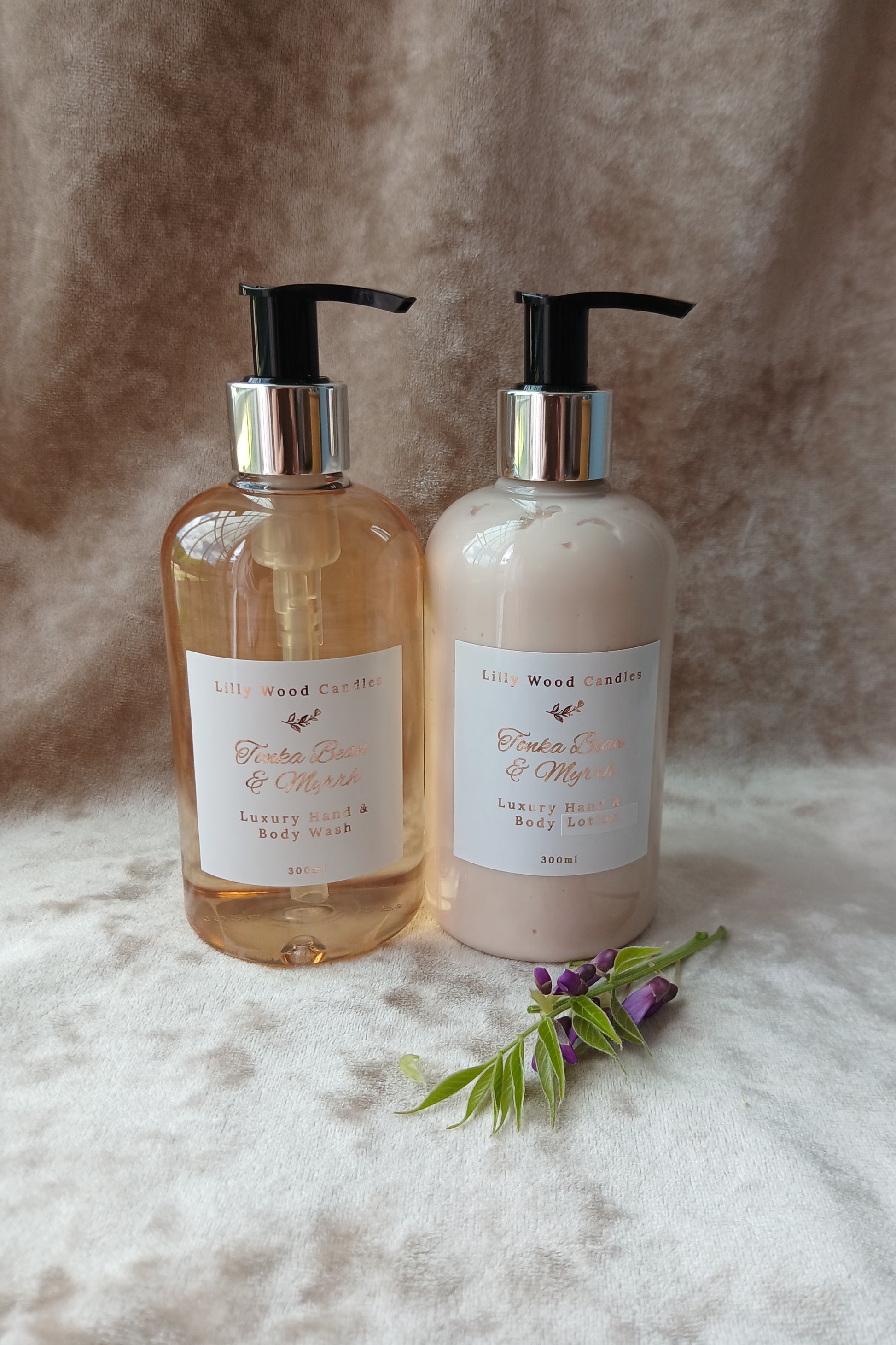 Luxurious tonka bean & myrrh hand & body lotion and hand & body wash.