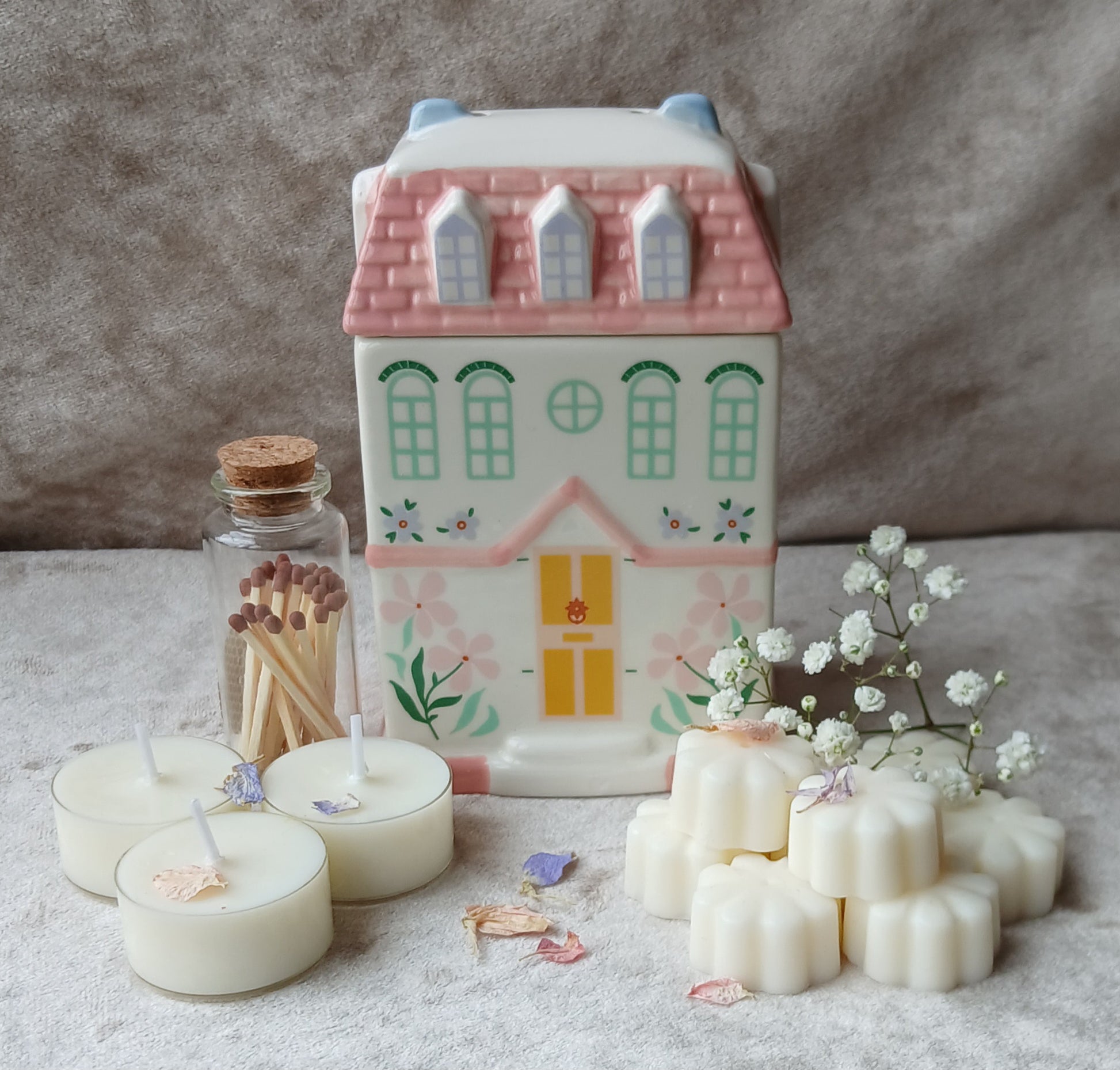 A pretty pastel house wax melt burner in a gift box, with 10 natural soy wax, flower shape melts, infused with high quality, vegan friendly, cruelty free and paraben free essential oils and fragrance oils. The wax melts are individually wrapped, this way you get a selection of 10 different gorgeous scent to try. Each wax melt is approximately 10g. The tealights are handmade, using soy wax, in polycarbonate eco friendly cups, which come wrapped in a glassine bag. A dinky glass bottle of safety matches, which has a little striker on the back, comes in a small hessian drawstring bag, plus a wax melt safety/care card. All orders are gift wrapped using as much eco-friendly, biodegradable packaging as I can. This includes a kraft gift box, shredded paper/wood wool and beautifully completed with a sprinkle of dried flower petals with an organza bow and cream & brown paper ribbon, giving your parcel a timeless and rustic feel.