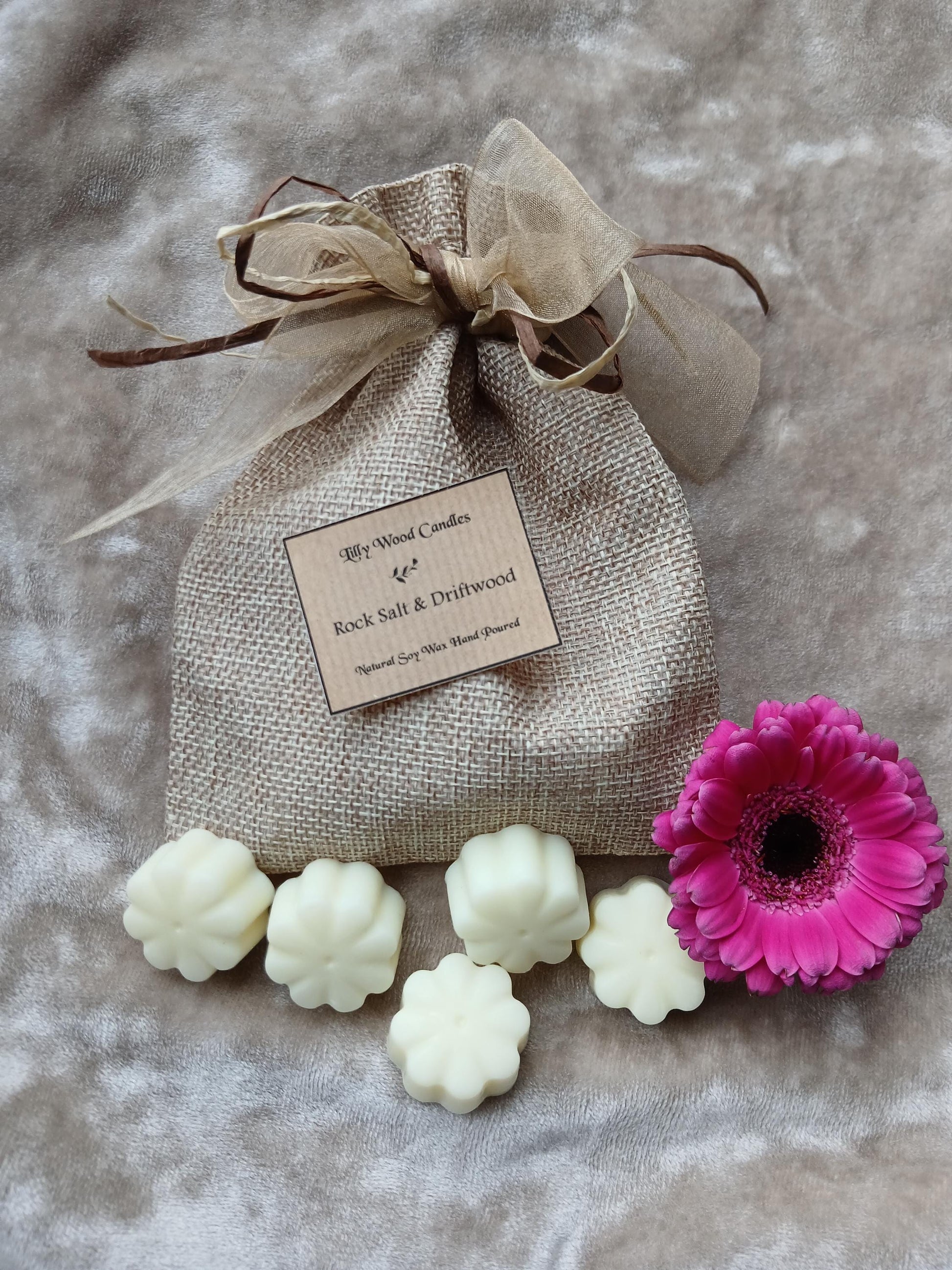 Rock Salt & Driftwood wax melts are available in packs of 5. All melts are handmade with 100% soy wax, they are infused with a beautiful rock salt & driftwood fragrance oil, which is vegan friendly, cruelty free & paraben free.