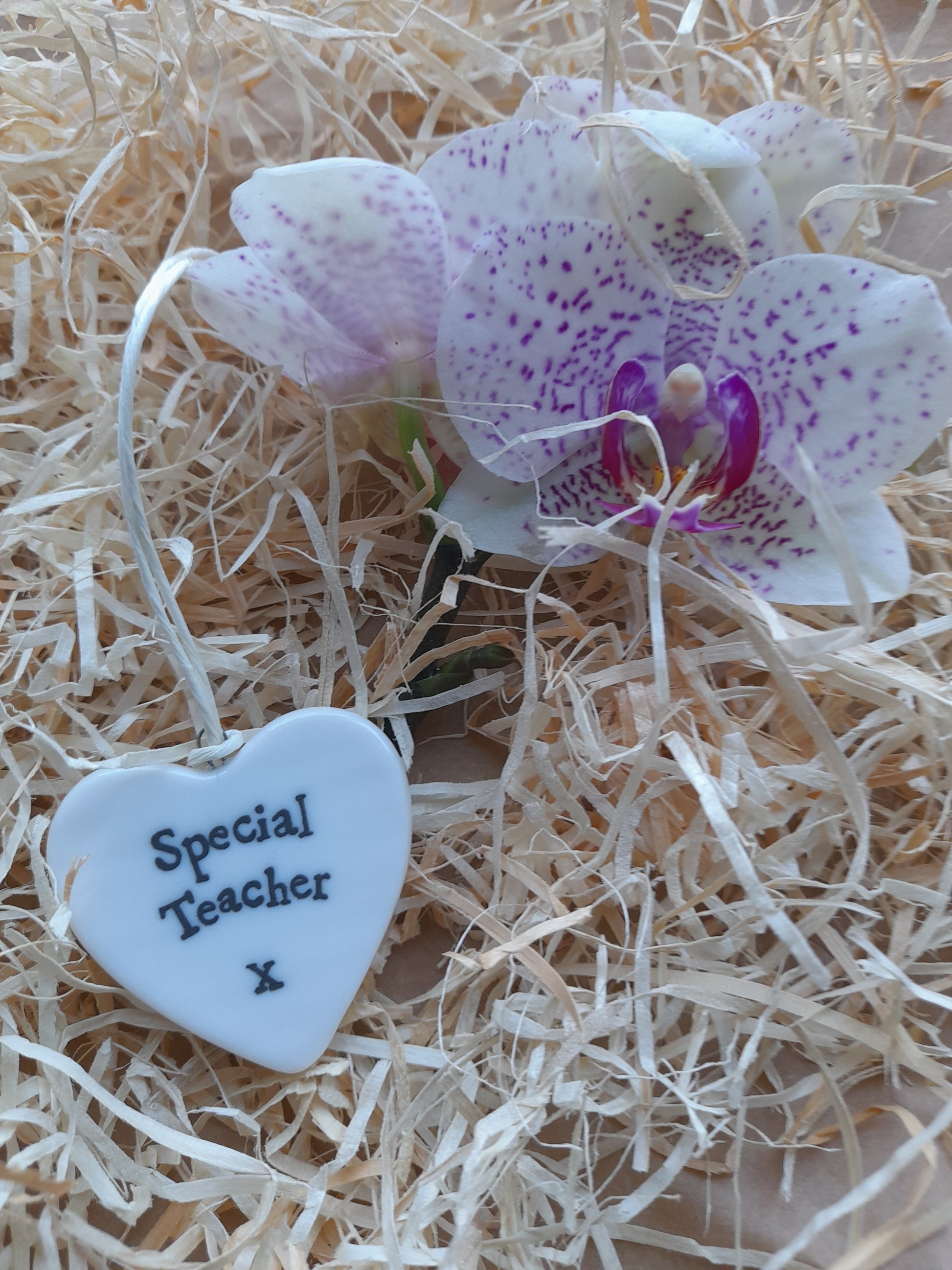 This cute little ceramic heart is the perfect gift for your special teacher. It comes in a small drawstring hessian bag