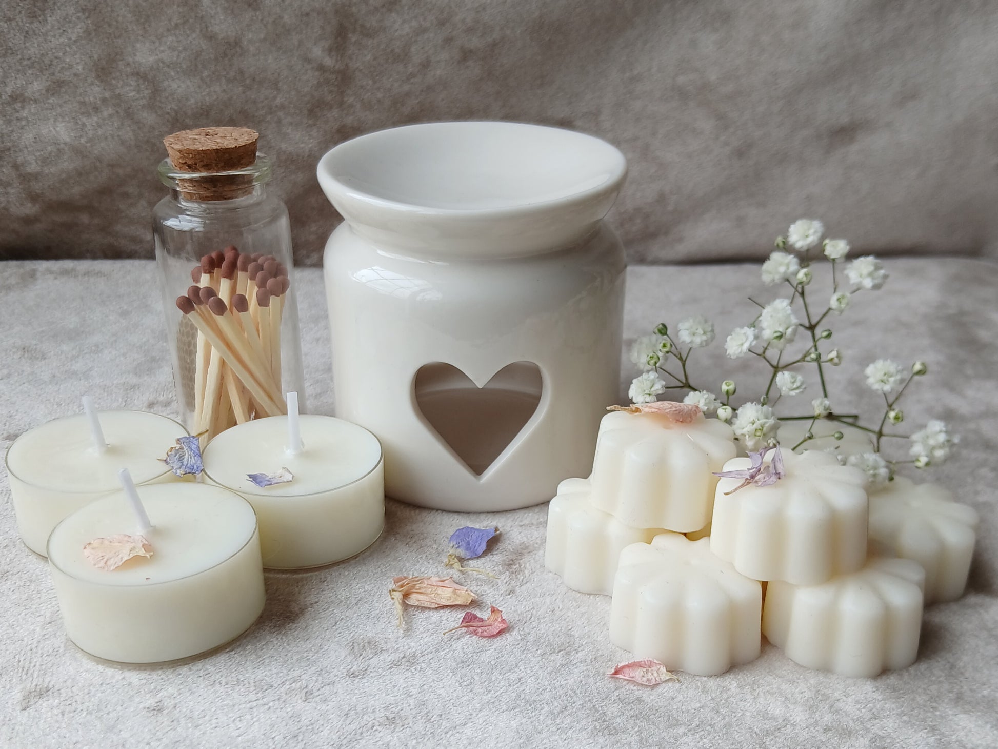 Lovely petite cut out heart, wax melt burner in a gift box, with 5 x natural soy wax, flower shape melts, infused with high quality, vegan friendly, cruelty free and paraben free essential oils and fragrance oils. The wax melts are individually wrapped, this way you get a selection of 5 different gorgeous scent to try. Wax melt are approximately 10g each. The tealights are handmade, using soy wax, in polycarbonate eco friendly cups, which come wrapped in a glassine bag, there are 2 x tealights included. A dinky glass bottle of safety matches, which has a little striker on the back, comes in a small hessian drawstring bag, plus a wax melt safety/care card. All orders are gift wrapped using as much eco-friendly, biodegradable packaging as I can. This includes a kraft gift box, shredded paper/wood wool and beautifully completed with a sprinkle of dried flower petals with an organza bow and cream & brown paper ribbon, giving your parcel a timeless and rustic feel.